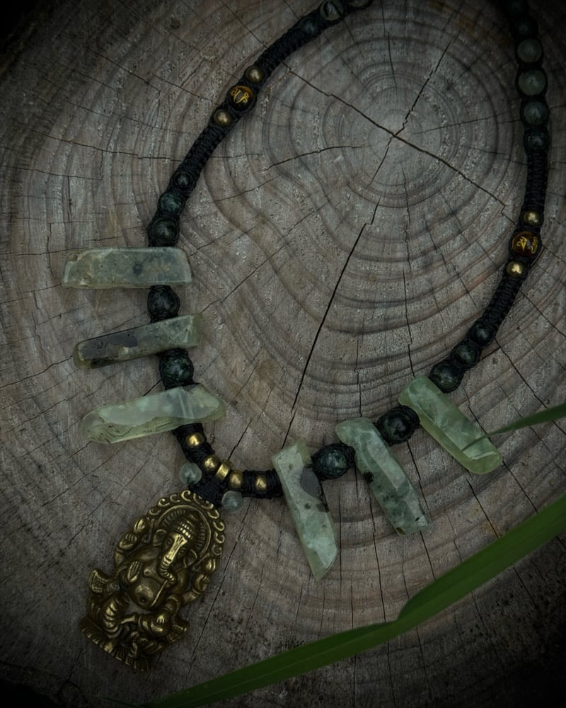 Handmade macrame necklace with a brass Ganesh pendant, Prehnite points & beads, with kambaba & Tibetan mantra carved tigerseye beads.