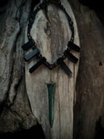 Handmade macrame necklace with a Greatsword pendant, obsidian points & beads with jasper & red tigerseye beads.