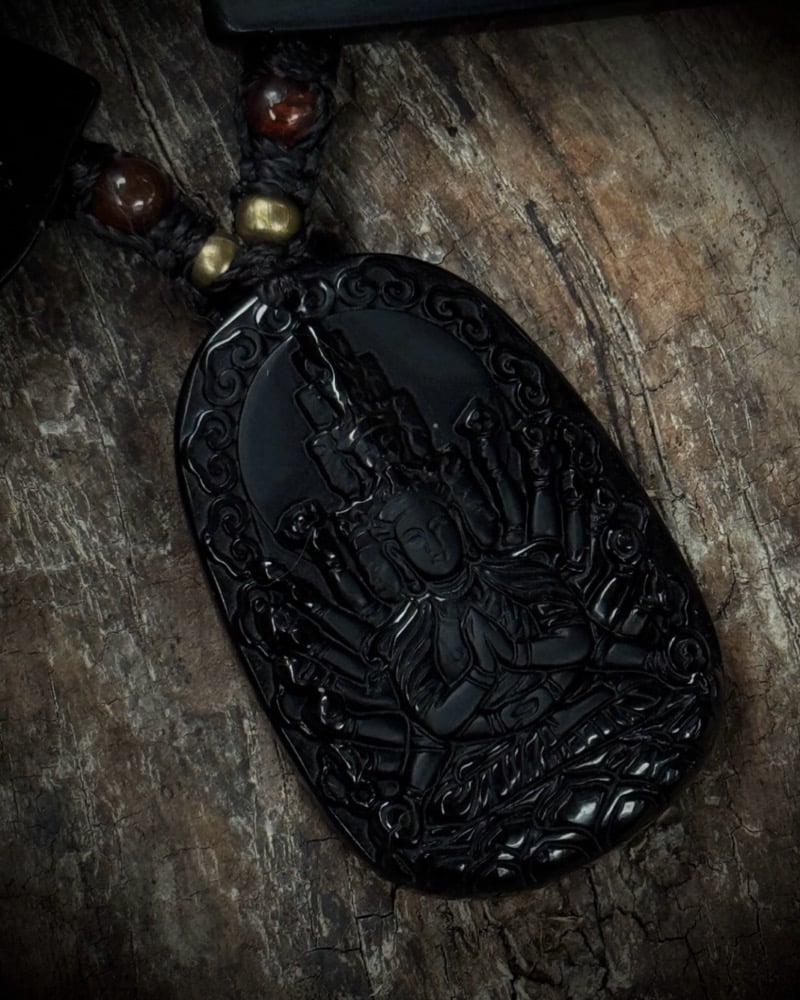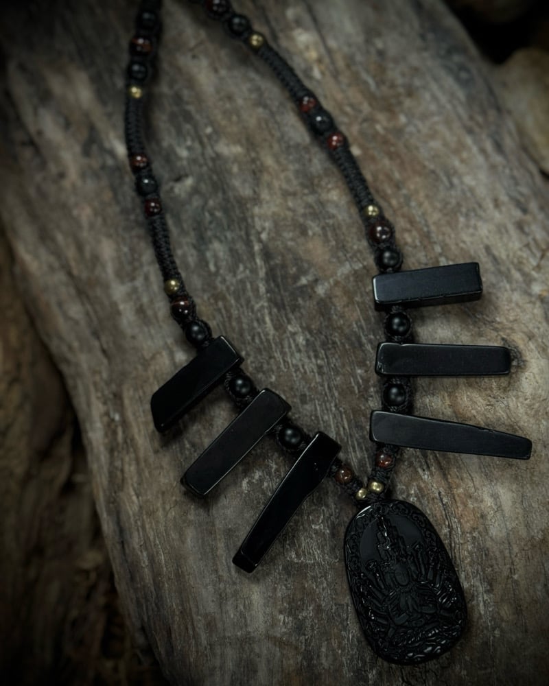 Handmade macrame necklace with a obsidian carved Druga pendant, obsidian points & beads with red tigerseye, obsidian carved Tibetan mantra beads, brass & onyx beads.