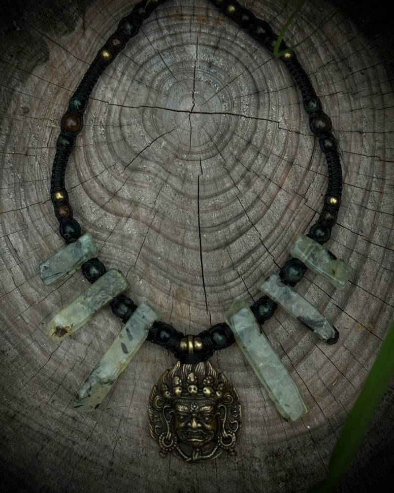 Handmade macrame necklace with a brass Mahakala pendant, prehnite points & beads with kambaba jasper & bronzite beads.