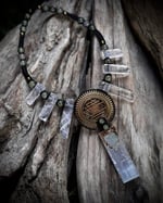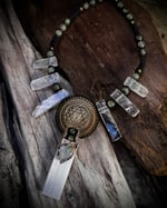 Handmade macrame necklace with a large Sri Yantra pendant, a Selenite pendant with a piece of green fluorite ontop, clear quartz points, Prehnite & citrine beads. Size adjustable, worldwide tracked shipping
